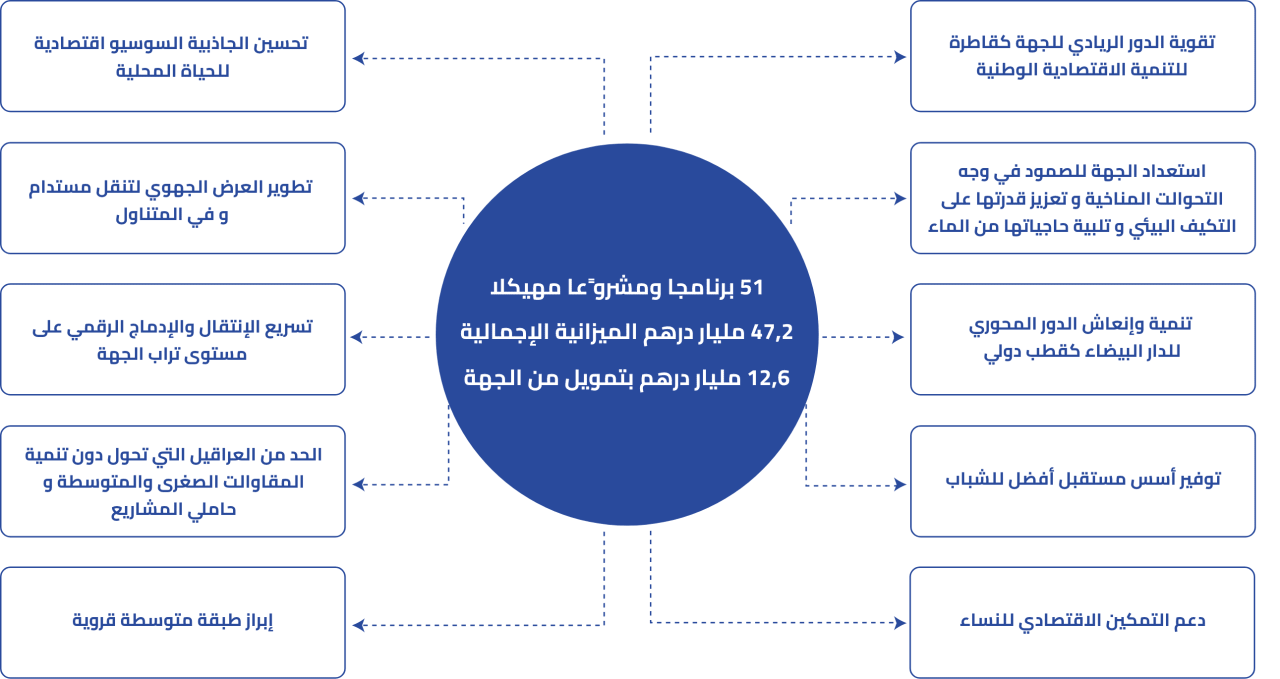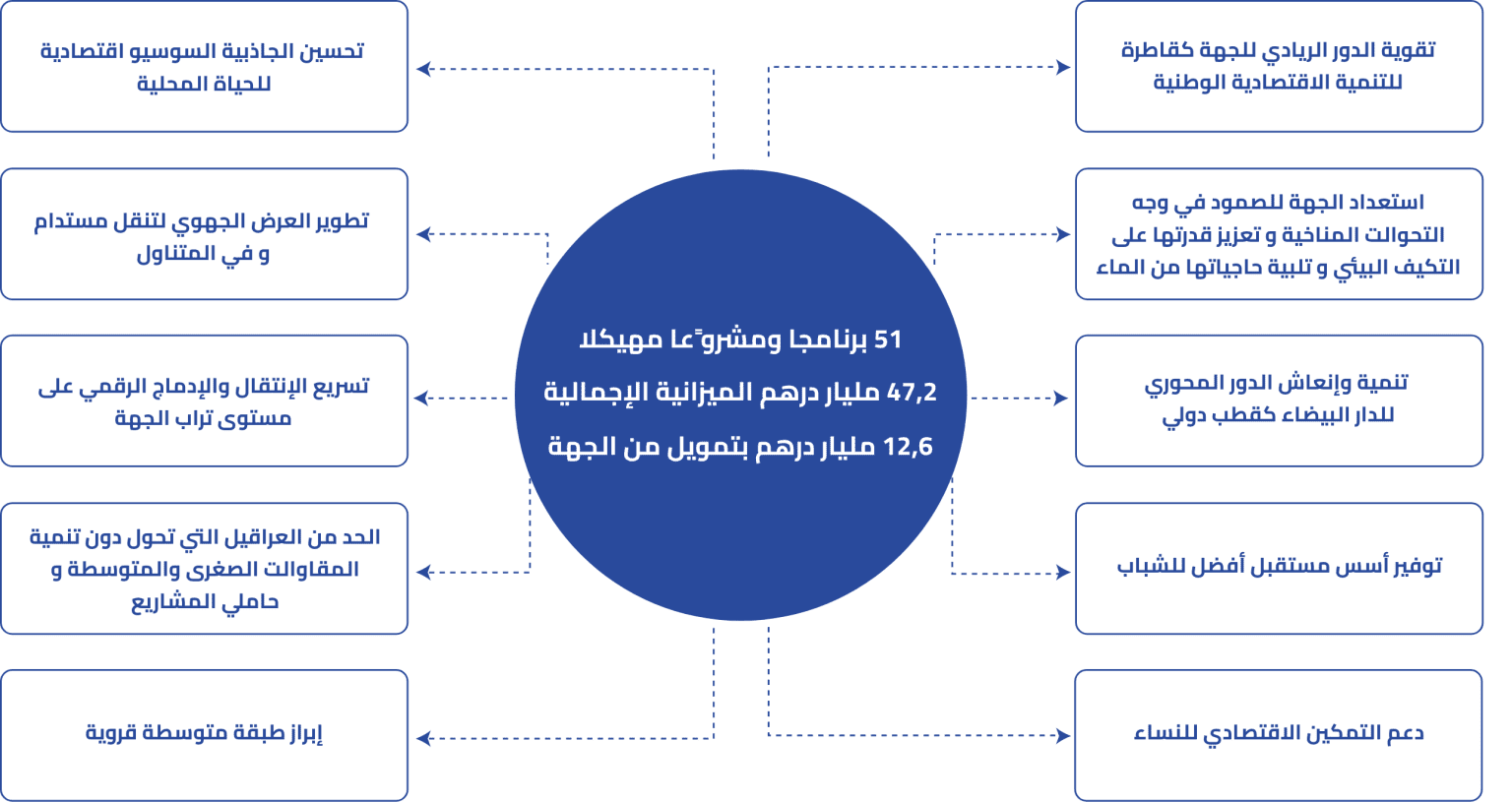 ويهدف هذا البرنامج إلى تحسين الجاذبية السوسيو-اقتصادية للحياة المحلية، تقوية الدور الريادي للجهة كقاطرة للتنمية الإقتصادية الوطنية، تطوير العرض الجهوي لتنقل مستدام وفي المتناول، استعداد الجهة للصمود في وجه التحولات المناخية وتعزيز قدرتها على التكيف البيئي وتلبية حاجياتها من الماء، تسريع الإنتقال والإدماج الرقمي على مستوى تراب الجهة، تنمية وإنعاش الدور المحوري للدار البيضاء كقطب دولي، دعم التمكين الاقتصادي للنساء ، توفير أسس مستقبل أفضل للشباب، إبراز طبقة متوسطة قروية والحد من العراقيل التي تحول دون تنمية المقاولات الصغرى والمتوسطة وحاملي المشاريع.
