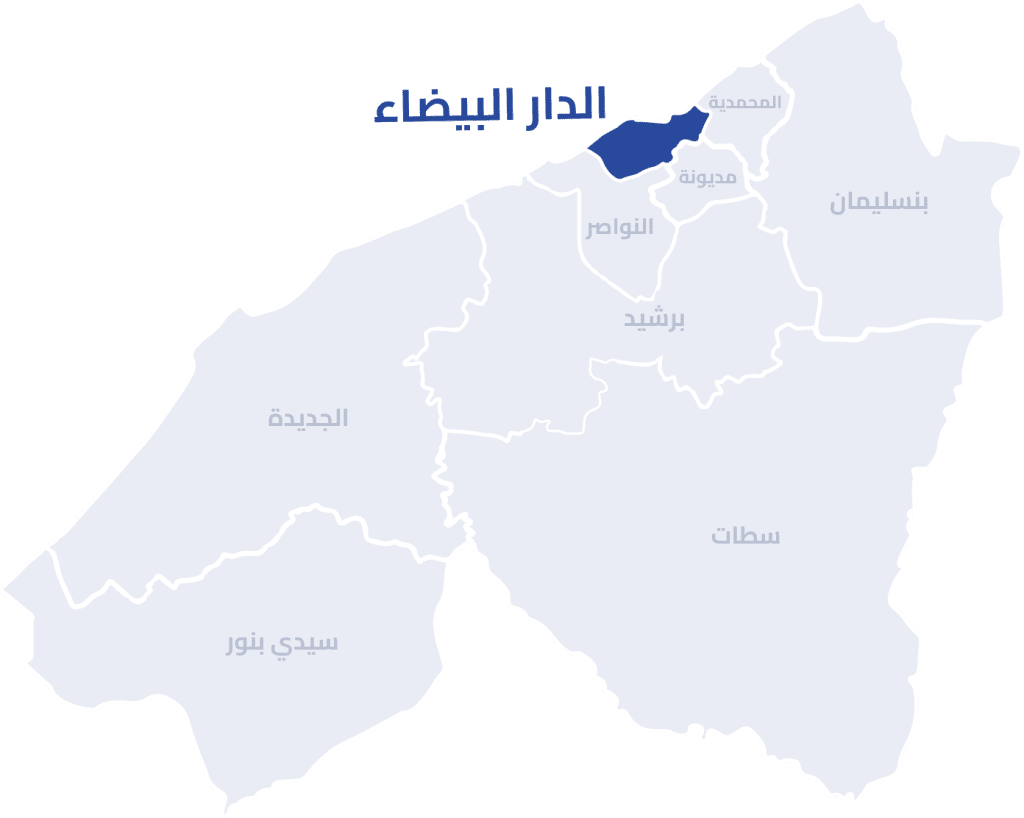 - تتكون الجهة من 2 عمالتين (الدار البيضاء والمحمدية) و 7 أقاليم (النواصر، مديونة، سطات، برشيد، الجديدة، سيدي بنور، وبنسليمان).